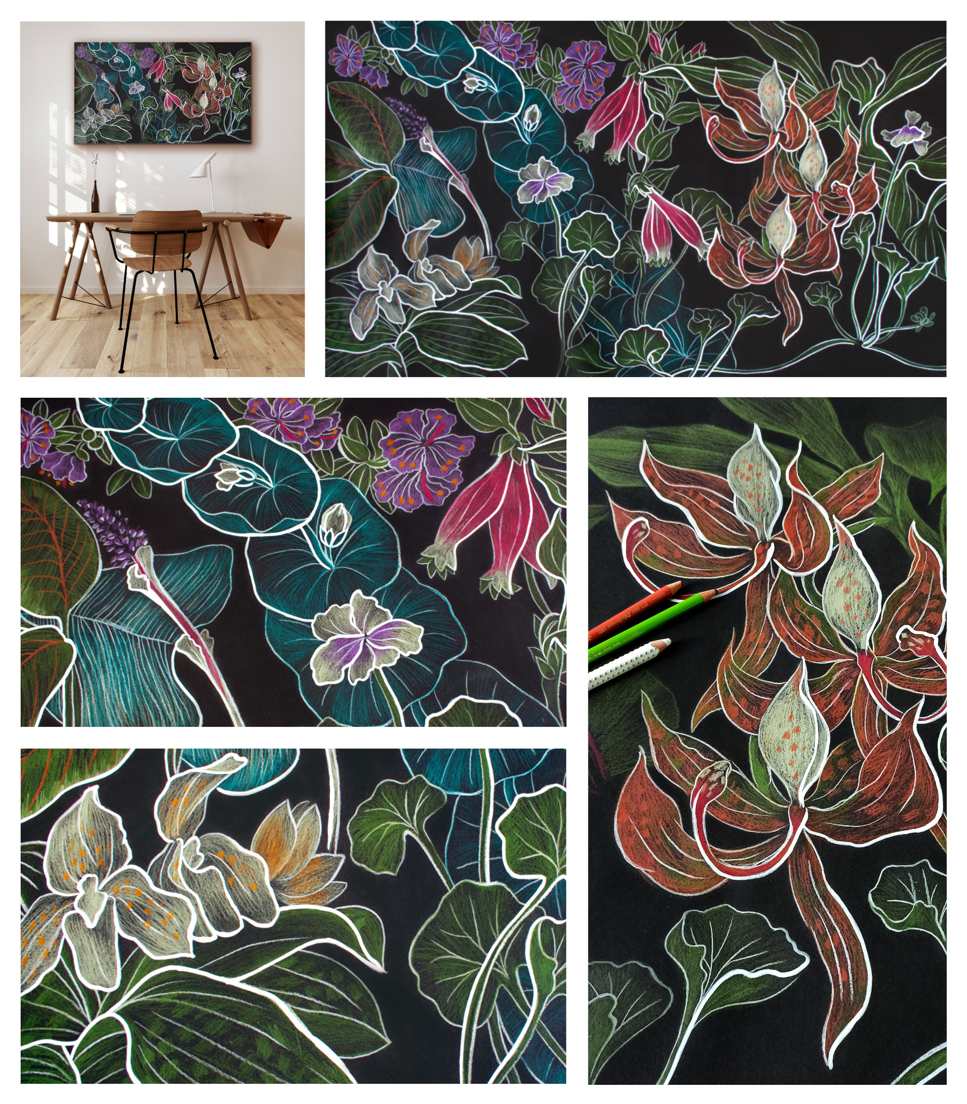 Color pencils and acrylic markers on black paper. 90 x 54 cm.
